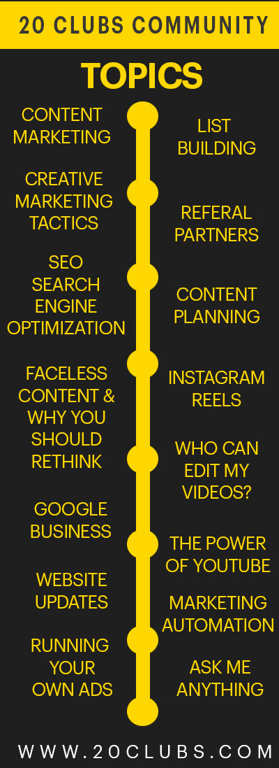 Join the 20 CLUBS Community where you'll get all the marketing support, collaboration, feedback, and access to done for you services.